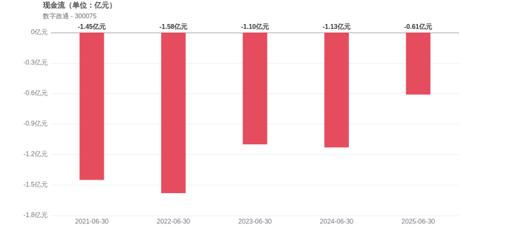 在经营稳健性方面,数字政通面临存货周转效率下降的挑战,存货周转天数为98.85天,较2024年上半年增长了16.28%,显示出公司库存管理压力加大。经营活动产生的现金流净额为-0.61亿元,虽然较2024年同期的-1.13亿元有所改善,但仍为负值。此外,2025年上半年的资产负债率为13.61%,同比下降了3.47个百分点,这意味着公司负债总额占资产总额的比重在减少,财务杠杆有所降低。